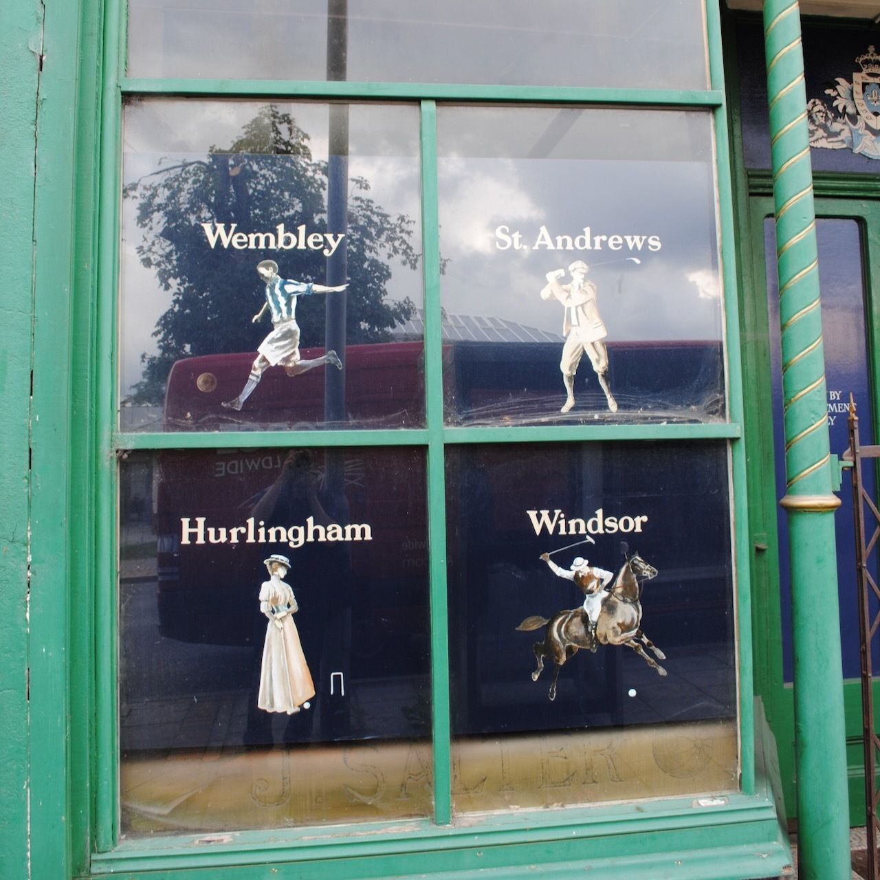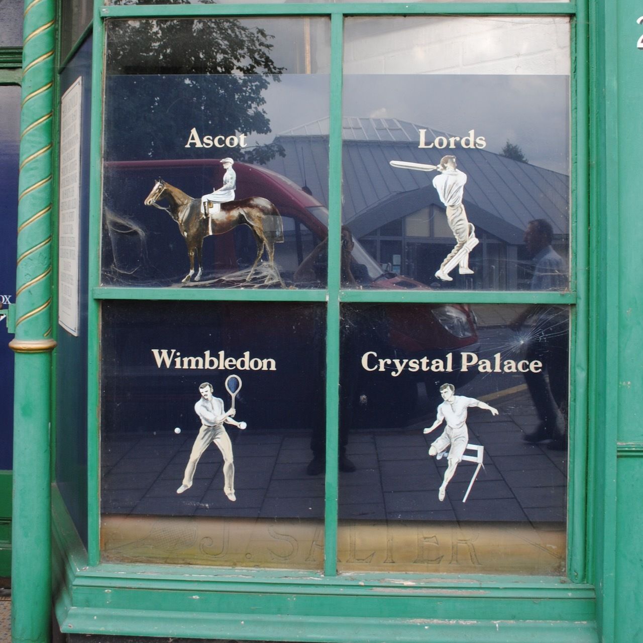 The shop front still carries illustrations of classic British sporting venues: Hurlingham, Windsor, Wembley, St Andrews, Crystal Palace, Ascot, Lords, Wimbledon. This blazonry on the dusty windows of an obscure shuttered shop in Aldershot is a poignant memorial to a more innocent sporting age: before image rights, before doping scandals, before institutionalized corruption.